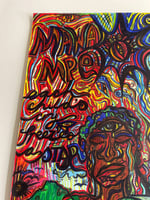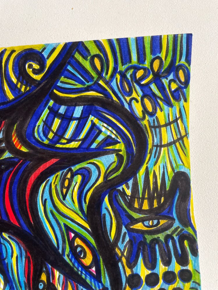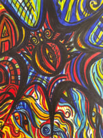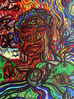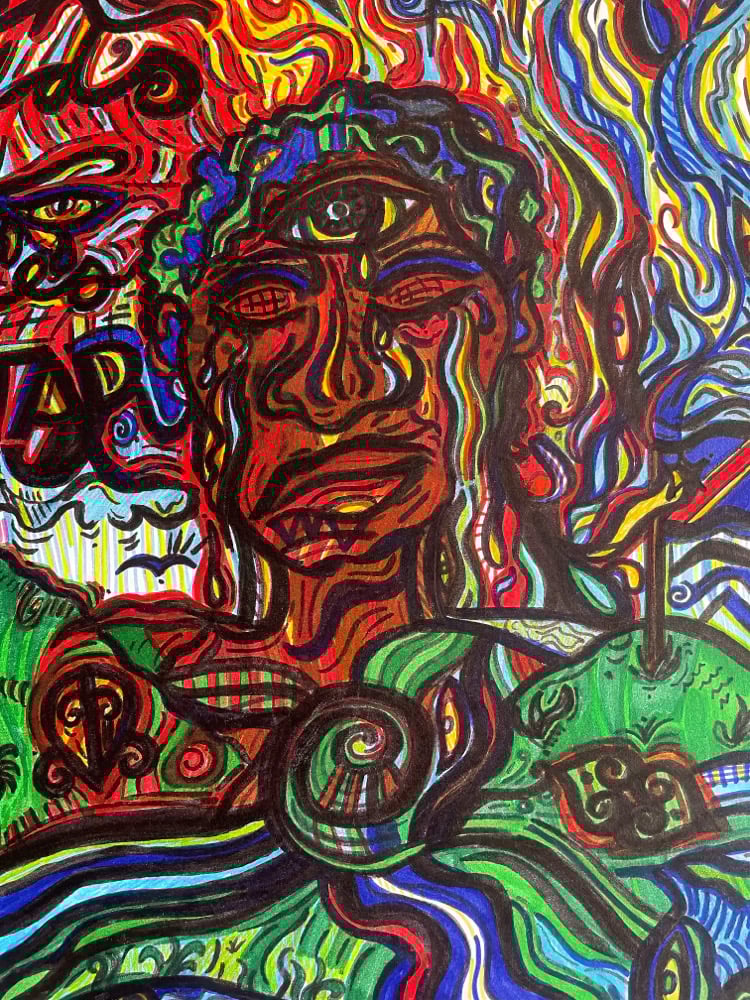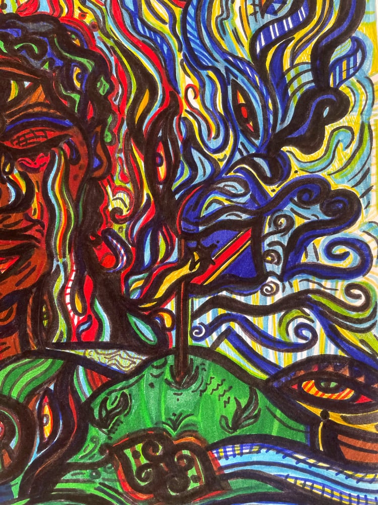 A face emerges from the chaos — grounded, watchful, ancestral. The lush greens of the land root the composition below, while starlight flames of red, gold, and blue rage above in reflection of the Congolese flag. Eyes are hidden throughout the work, watching, witnessing.