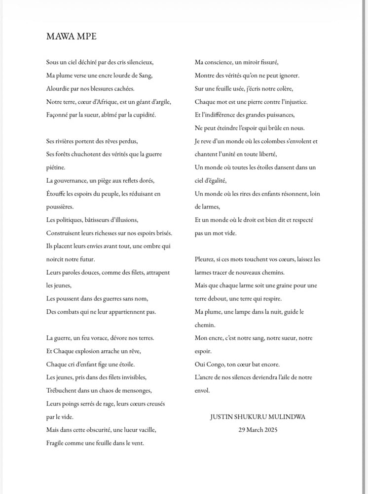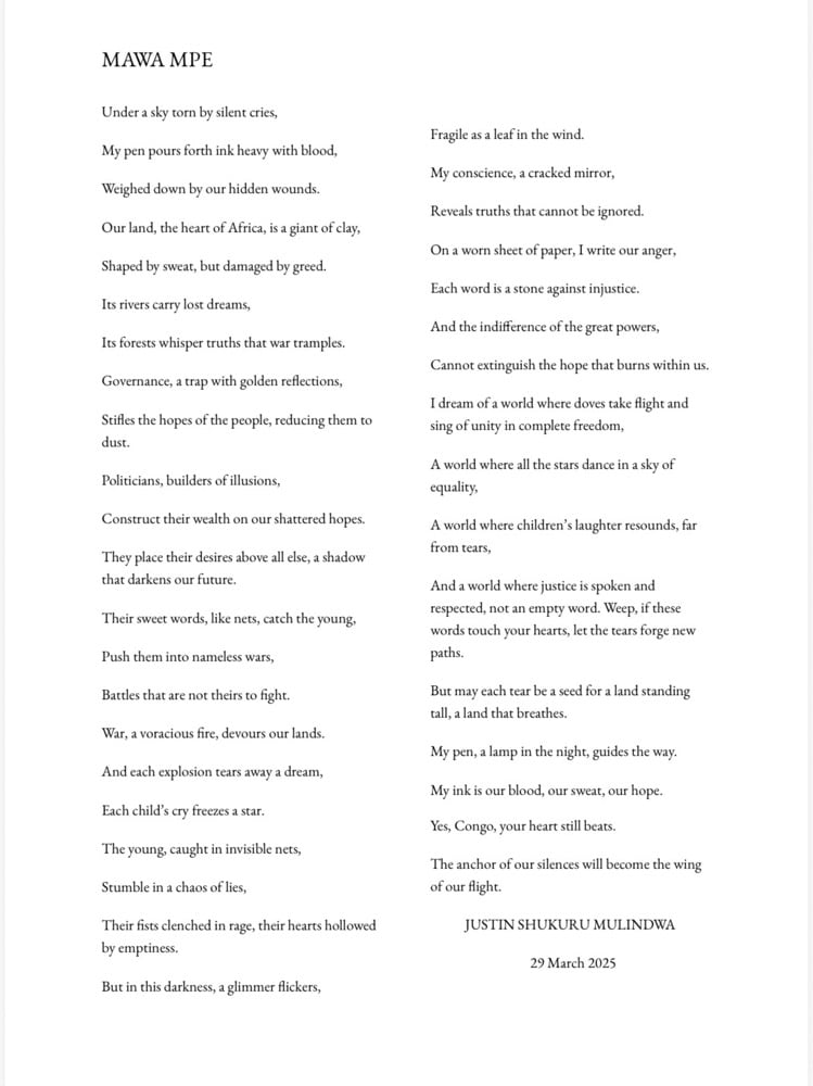 ‘Mawa MPE’ is a powerful poem by Congolese poet, activist and law student Justin Shukuru Mulindwa, written in both English and French.