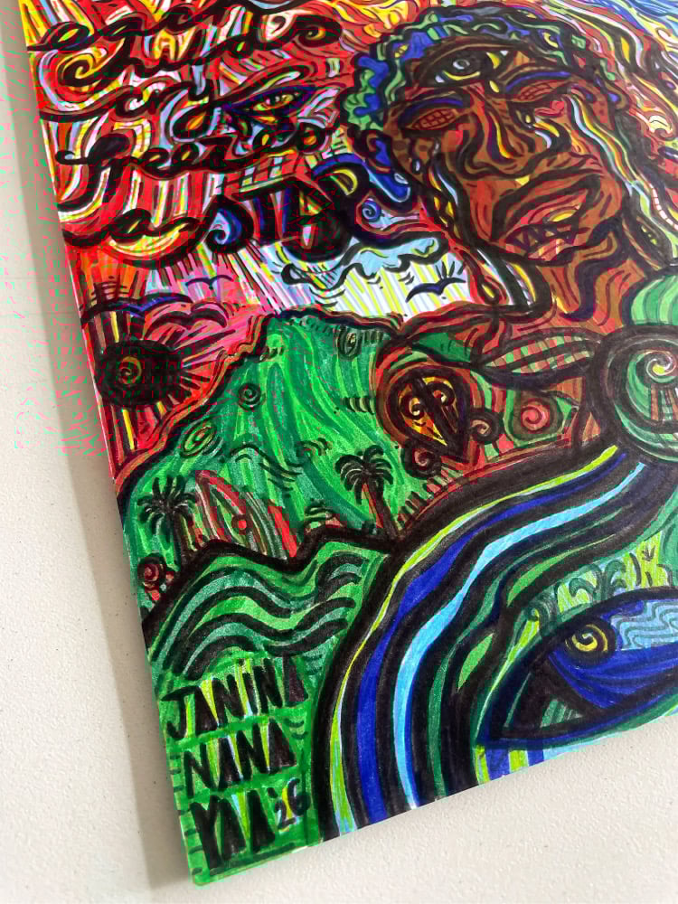 Janina’s artwork embraces the use of vibrant tones to call the unseen to be seen - honouring African Divinities, Adinkra symbols and mystical forces of Nature. Their heart is most fulfilled when uplifting LGBTQIA+, African, Black and Brown community. Deeply inspired by Indigenous patterns, line work and naturally informed by their upbringing in Tāmaki Makaurau their art reflects their ancestral migration as manu / tauiwi and the ongoing connection to whenua and Tangata Whenua Māori.